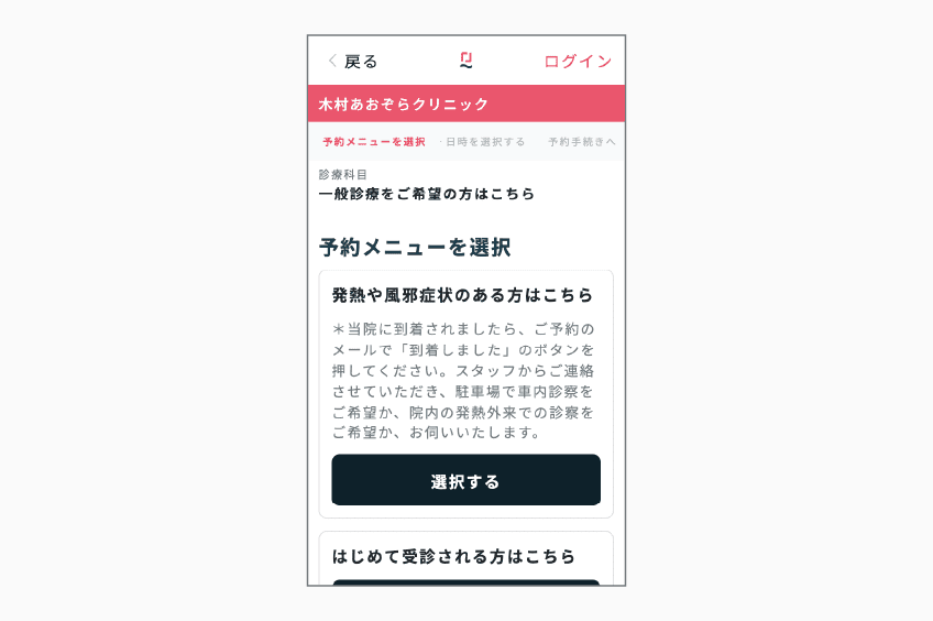 「発熱や風邪症状のある方はこちら」「はじめて受診される方はこちら」「診察券をお持ちの方はこちら」「当日順番予約の方はこちら」の中から、ご希望のメニューを選択します。