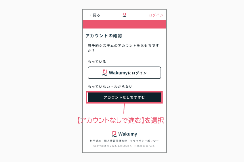 アカウントをお持ちの方は「Wakumyにログイン」を選択、お持ちでない方は「アカウントなしで進む」を選択してください。