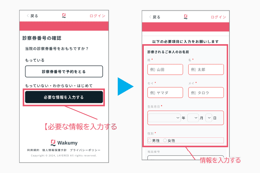 初めて受診する方は「必要な情報を入力する」を選択して、お名前など患者さんの情報を入力してください。