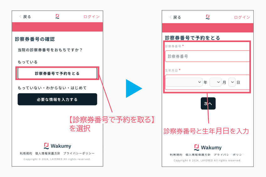 再診の方は「診察券番号で予約をとる」を選択して、診察券番号と生年月日を入力してください。
