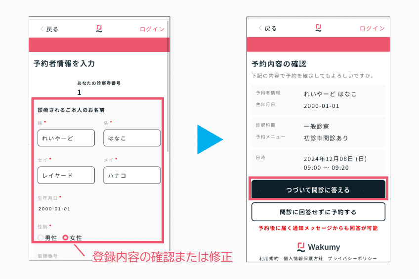 登録内容に変更・修正がある場合はこちらの画面で操作できます。内容の確認を行い、つづいて問診の回答へ進みます。